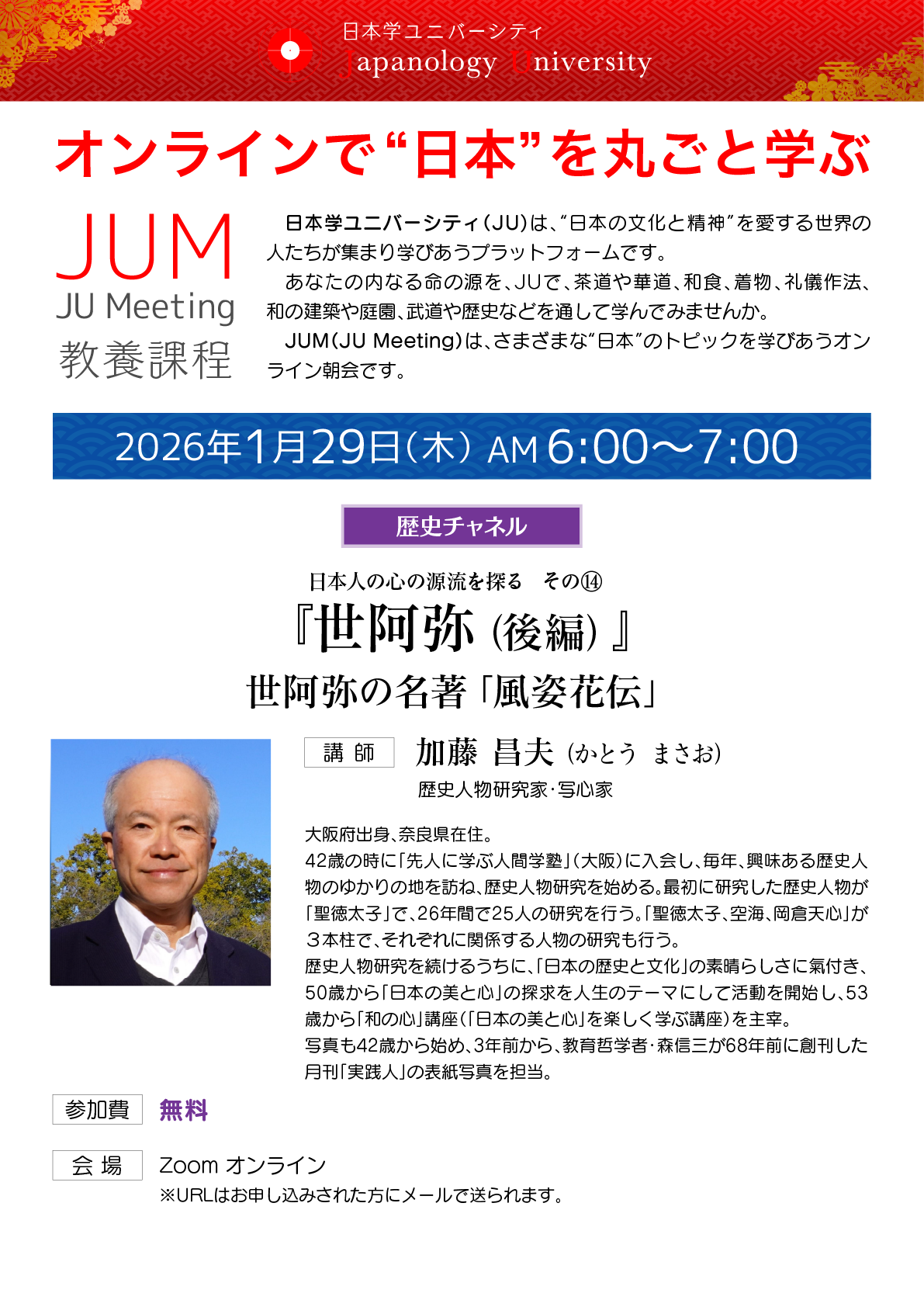 0129 JUM 世阿弥(後編)〜世阿弥の名著「風姿花伝」/加藤 昌夫 受付終了