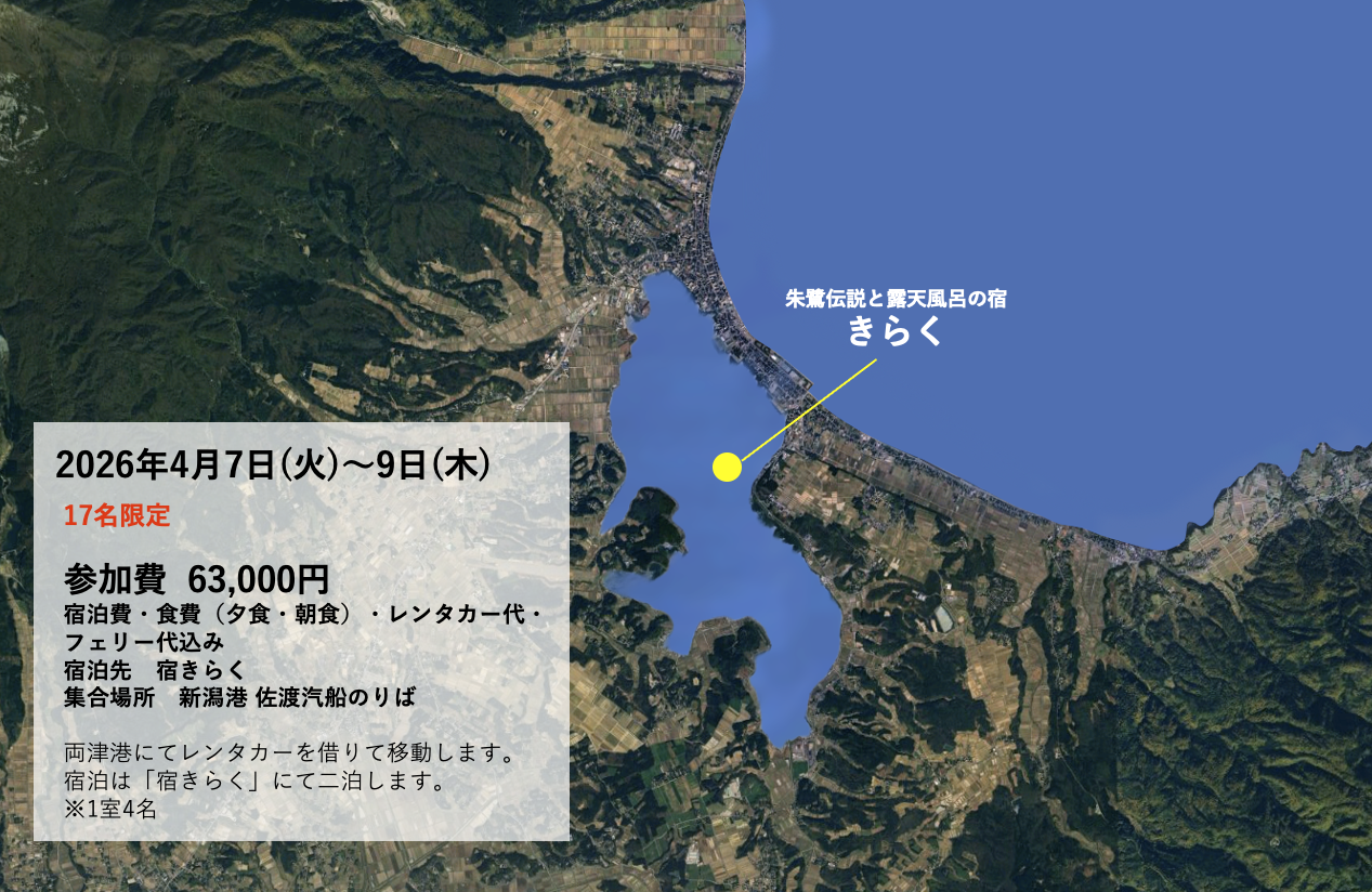 解散時間:4月9日(木)17:40 / 解散場所:新潟港期間中は、両津港にてレンタカーを借りて移動します。宿泊は「宿きらく」にて二泊します。※1室4名