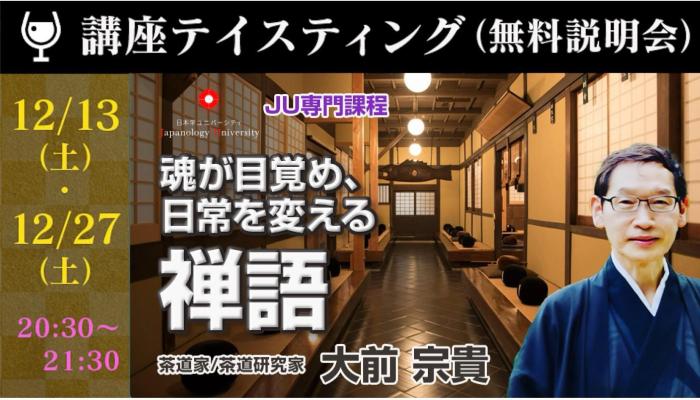 日本学ユニバーシティ(JU)の専門課程の講座テイスティング(無料説明会)です。50年以上の座禅体験と30年以上の指導実績をもとに、禅語に込められた「体感としての智慧」を、現代社会でどのように活かすのかを具体的に紐解いていきます。幾重にも意味を重ねる禅語の世界を、初めての方にも深く理解できるよう、懇切丁寧にお伝えします。本講座は、人生をあらためて問い直し、「魂が本当に望む生き方」へと歩み出すための貴重なひとときとなるでしょう。命を懸けて悟りを開いた先人たちが境地を一語に凝縮した――禅語という「魂の羅針盤」を、ともに学び深めてまいります。まずは無料体験会で味わってみてください。