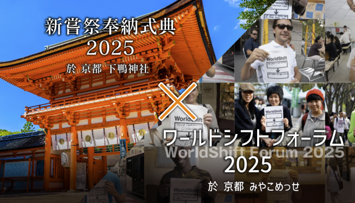 10:00 ~ 12:30 文化奉納14:00 〜 20:00 ワールドシフトフォーラム下鴨神社さんでの新嘗祭文化奉納は今年で5年目を迎えます。五穀豊穣のお祭りとして長年続いてきた新嘗祭を、みんなでお祝いしよう、日本文化を再復興する象徴としてのイベントとなります。新嘗祭再興プロジェクトが目指す世界、連綿と続いてきたお祭りを再興して各地域や世界へ、次世代へと連続量として繋ぎます。志ある人々が集い、その想いと日本文化を共に天へ奉納する。文化奉納後は直会をして新嘗の酒米塩を味わい、五穀豊穣をお祝いしましょう。